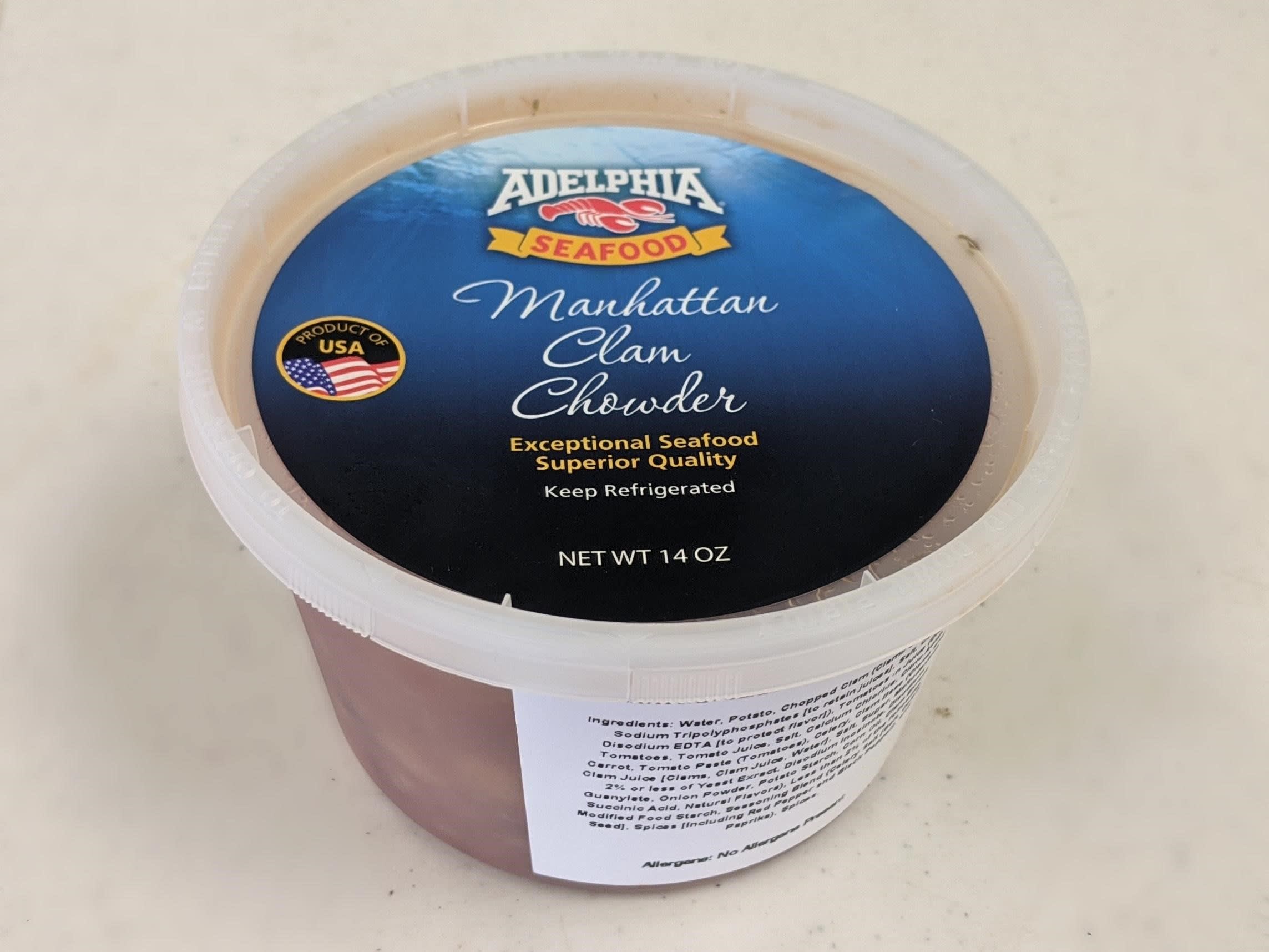 Frozen 14 oz. container of Manhattan clam chowder.