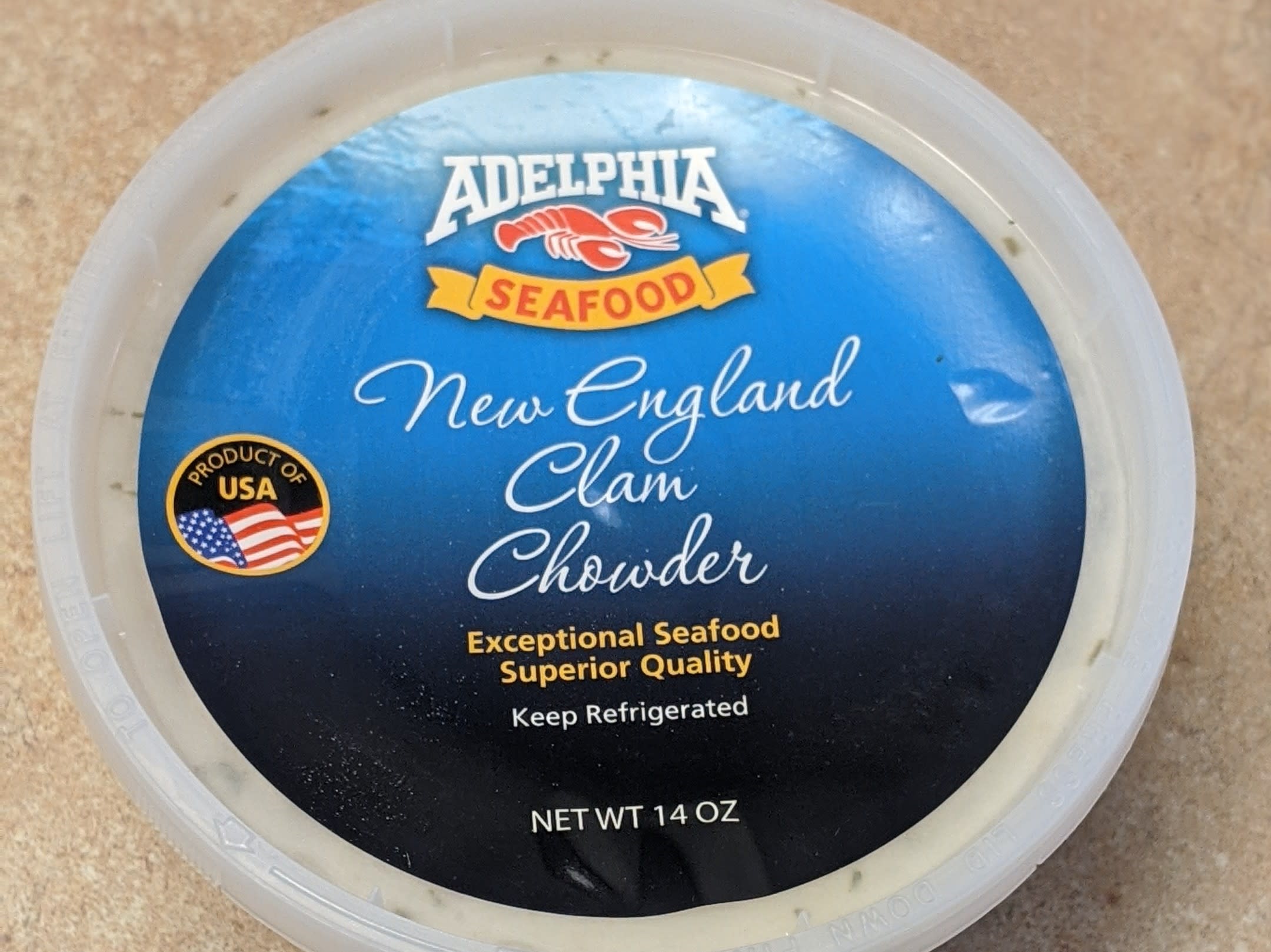 Frozen 14 oz. container of New England Clam Chowder.