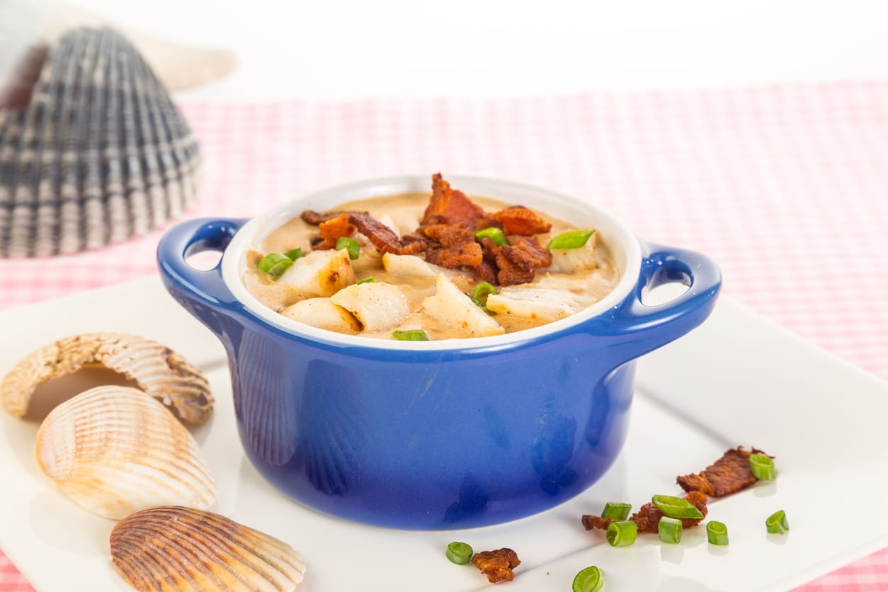 Frozen Pint container of scallop and bacon chowder.
