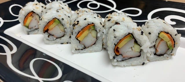 California Sushi Roll – King Krab stick, avocado, cucumber, and carrot – rice is sprinkled with sesame seeds