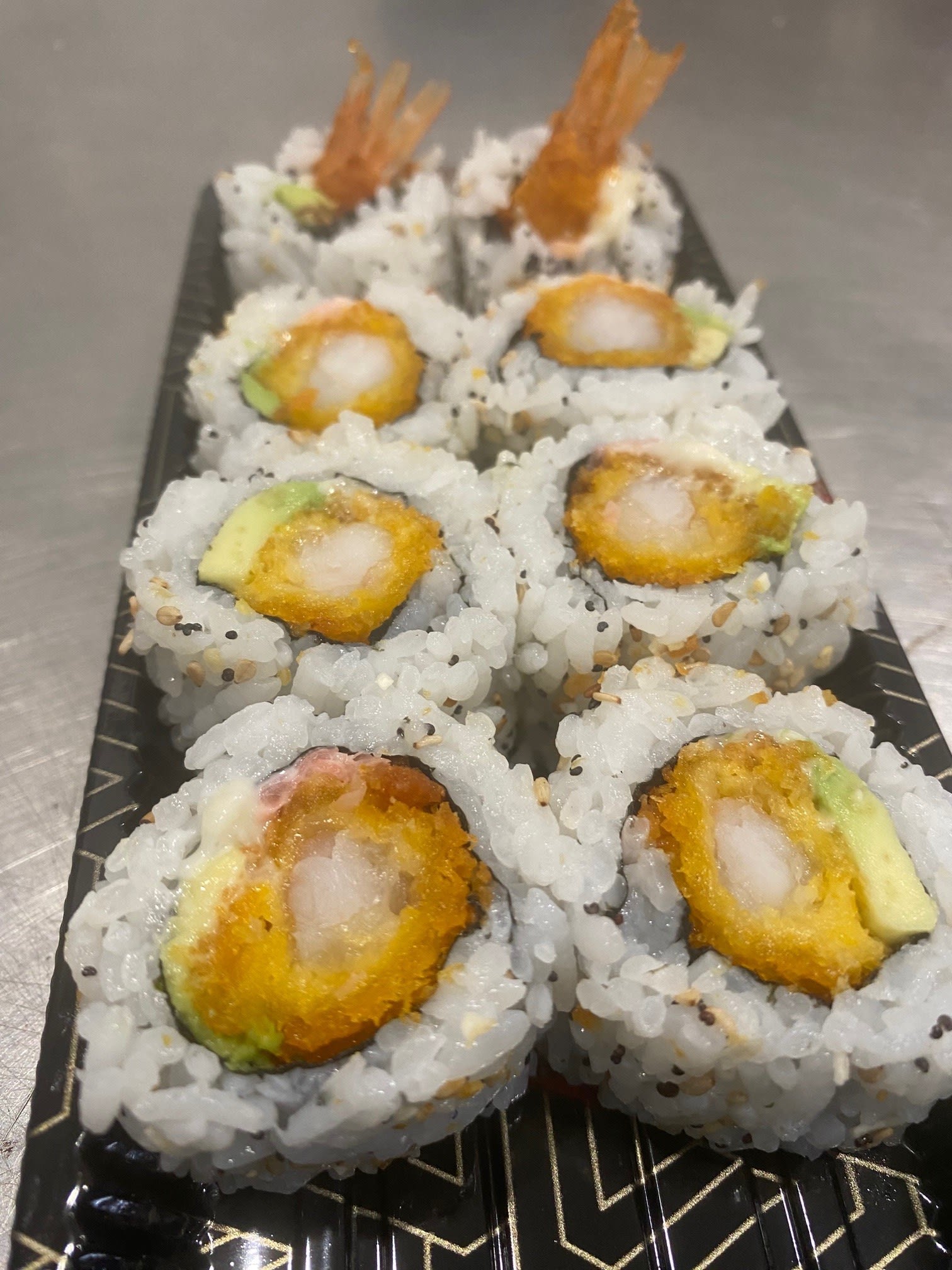H-Roll Sushi – Panko Breaded Shrimp, Avocado and Garlic Aioli, and Ginger – rice is sprinkled with sesame seeds