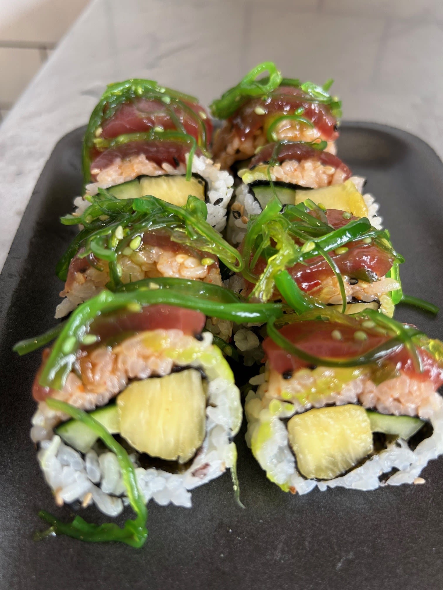 Honolulu Sushi Roll – yellowfin tuna, pineapple, and cucumber – topped with spicy Polynesian sauce and seaweed salad