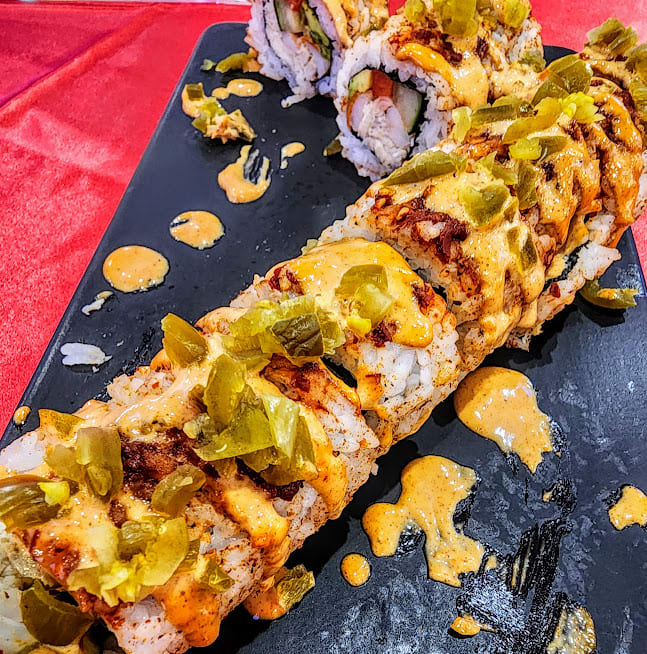 Louisiana Sushi Roll – avocado, carrot, cucumber, red pepper, shrimp, fresh blue crab meat – topped with house chili spread, Cajun remoulade, and diced pickled jalapenos – rice is sprinkled with all day Louisiana seasoning