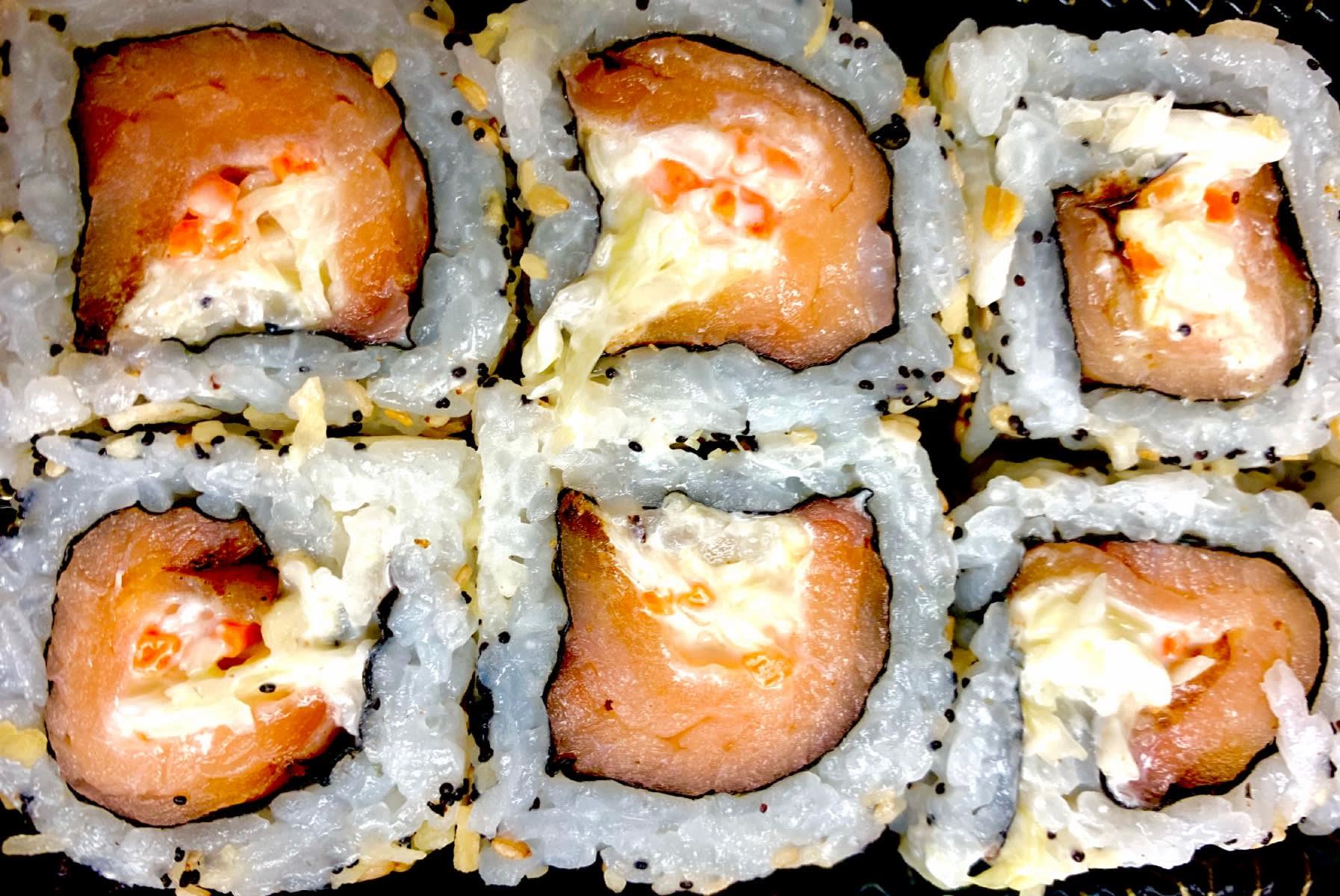New York Sushi Roll – pastrami style smoked salmon, coleslaw, and carrots – rice is sprinkled with everything bagel seasoning