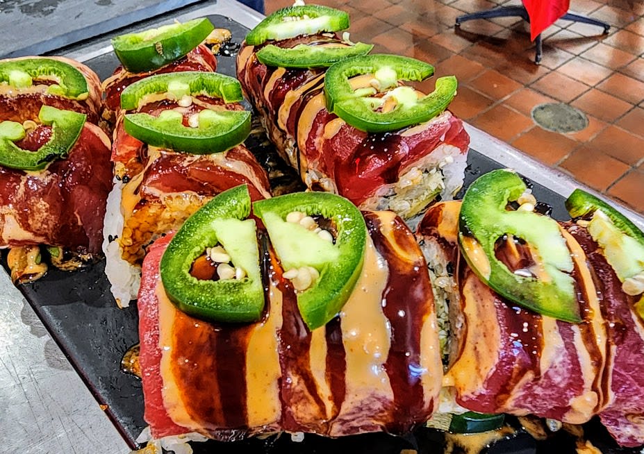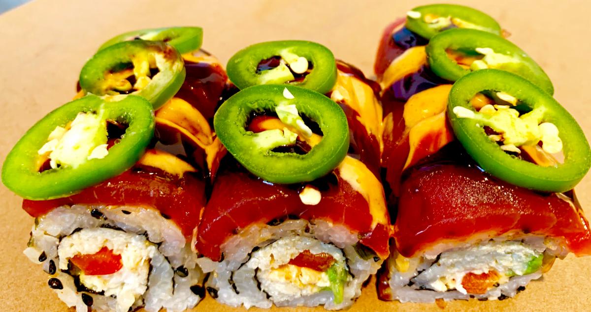 Pheonix Sushi Roll – fresh blue crab meat, boom boom sauce, avocado, and red pepper – topped with spicy Baja sauce, thinly sliced yellowfin tuna, and fresh jalapeno slices – drizzled with Japanese BBQ sauce and boom boom sauce – rice is sprinkled with sesame seeds