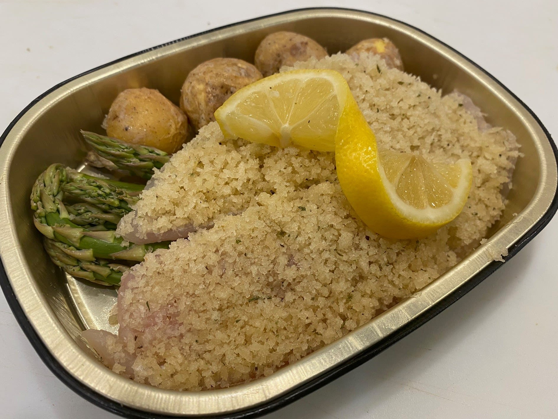 Tilapia Take N Bake Dinner – Tilapia topped with Parmesan Panko , Seasonal Vegetables, Baby Roasted Potatoes